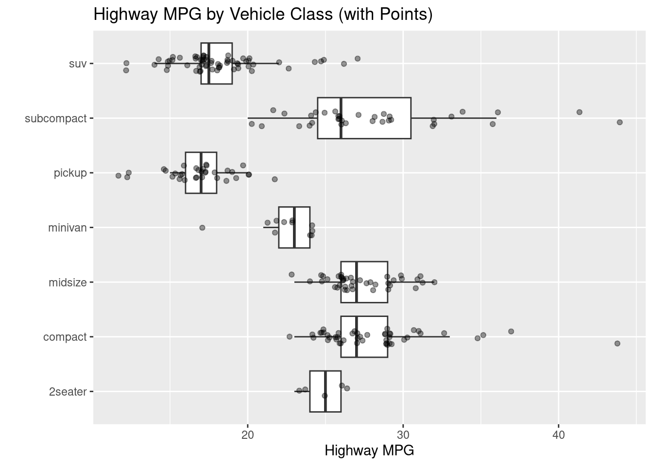 # WITH JITTERED POINTS OVERLAIDggplot(mpg, aes(class, hwy)) +geom_boxplot(outlier.shape =NA) +geom_jitter(width =0.15, alpha =0.4, size =1.5) +coord_flip() +labs(title ="Highway MPG by Vehicle Class (with Points)",x ="", y ="Highway MPG")