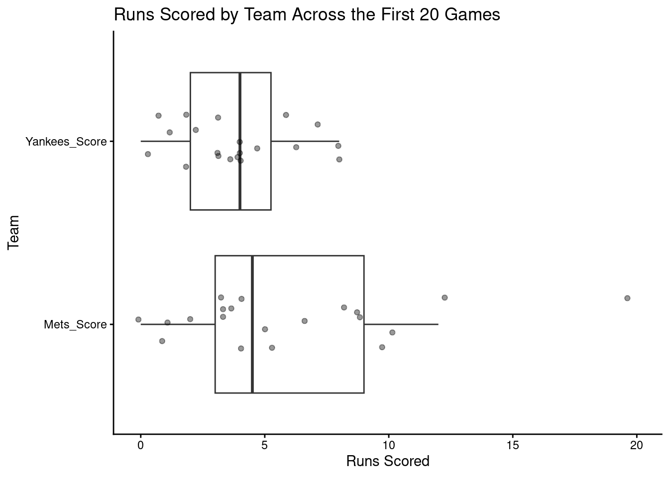 Fantastic! We now have one complete dataset with the scores of the Mets and Yankees in the first 20 games.