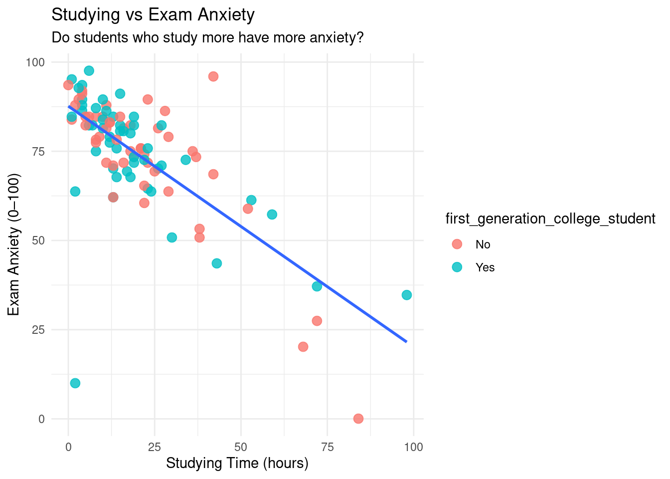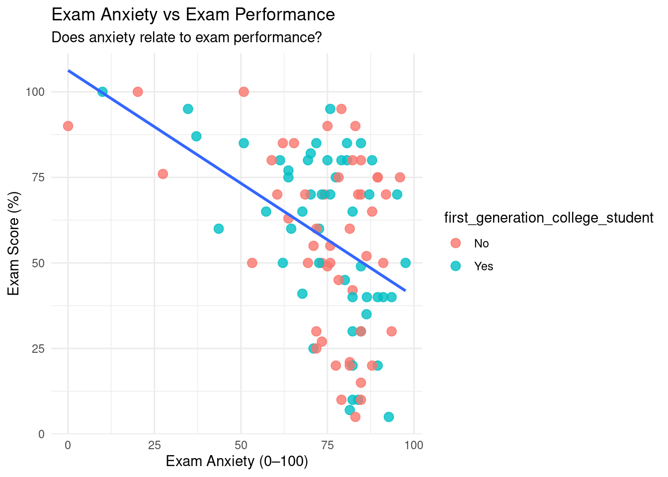 p2 <-ggplot(examData, aes(x = anxiety_score, y = exam_score)) +geom_point(aes(color = first_generation_college_student), size =3, alpha =0.8) +geom_smooth(method ="lm", se =FALSE) +theme_minimal() +labs(title ="Exam Anxiety vs Exam Performance",subtitle ="Does anxiety relate to exam performance?",x ="Exam Anxiety (0–100)", y ="Exam Score (%)" )p2