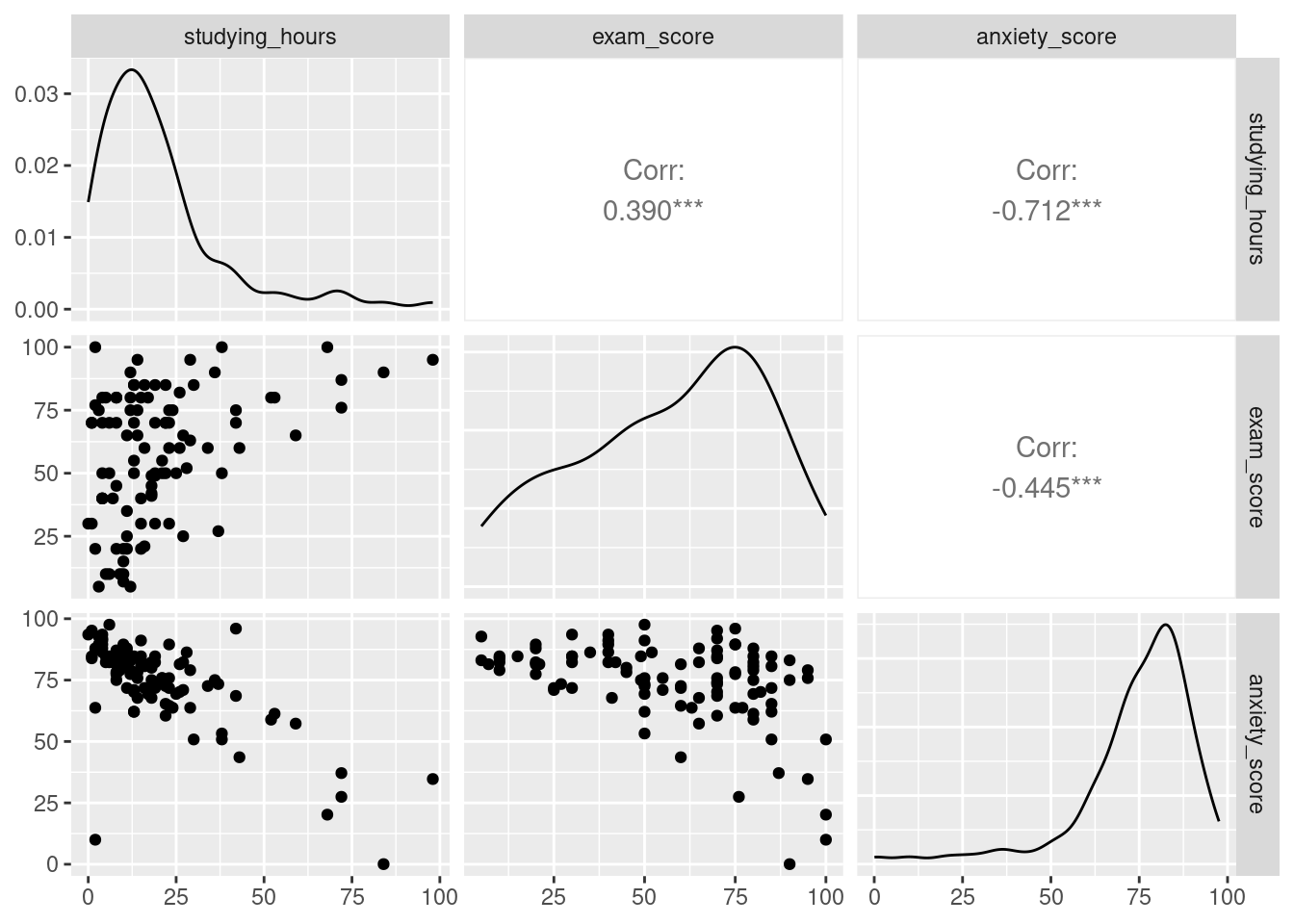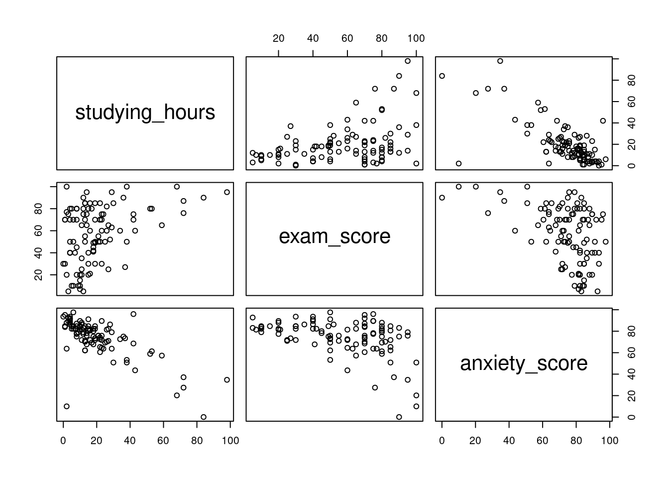 Since we are trying to better understand exam data, let’s create three scatterplots: one showing the relationship between studying and exam scores, one between anxiety and exam scores, and one between studying and anxiety. If you haven’t already, take some time to review scatterplots in Section Section 3.4.2.