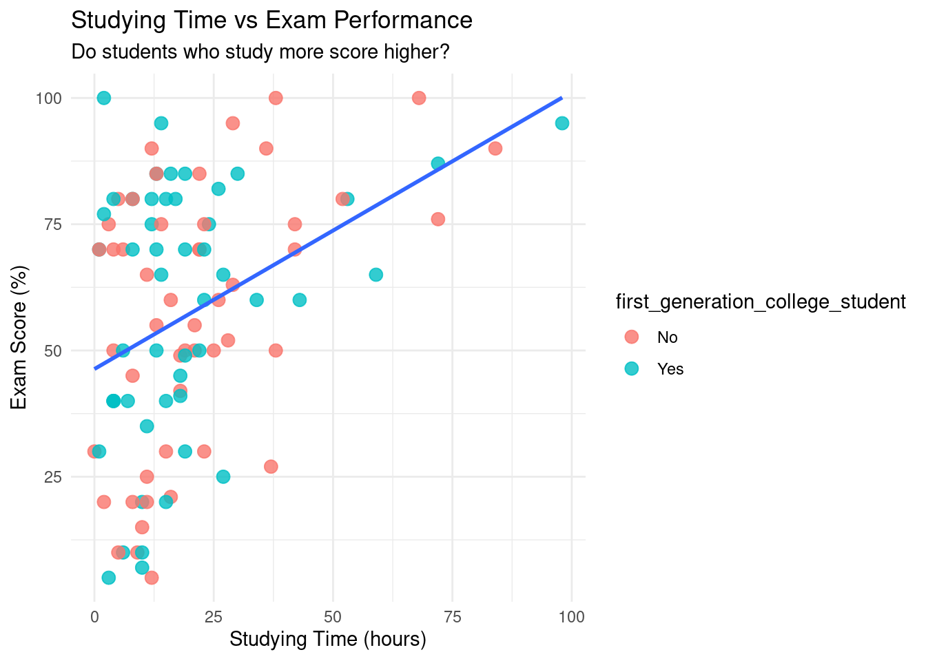 p1 <-ggplot(examData, aes(x = studying_hours, y = exam_score)) +geom_point(aes(color = first_generation_college_student), size =3, alpha =0.8) +geom_smooth(method ="lm", se =FALSE) +theme_minimal() +labs(title ="Studying Time vs Exam Performance",subtitle ="Do students who study more score higher?",x ="Studying Time (hours)", y ="Exam Score (%)" )p1